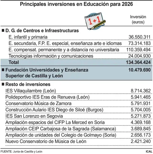 El proyecto de Presupuestos contempla 8,7 millones para el IES de Villaquilambre (León), 5,9 millones para el polideportivo IES Eras de Renueva de León y otros 5,7 millones para el Conservatorio de Zamora y para el aulario del IES Siloé de Burgos